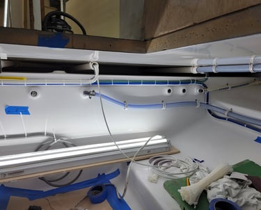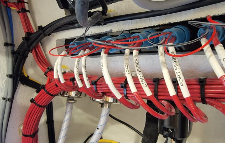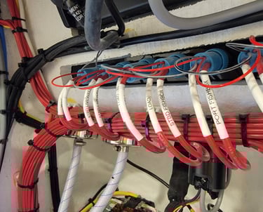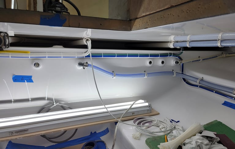 Wire routing for the mid bilge. Including Bilge Pump and Water Heating. Pictured is the wire route form Mid Bilge cleanly branching out to other parts of the boat.