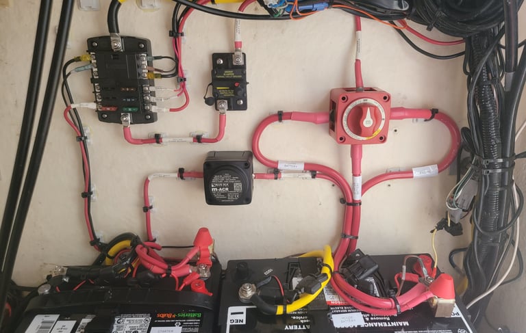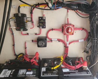 This was a rewire of a boats battery compartment. The house and start battery were updated. In addition a new battery switch, charging relay, and fuse block for increasing the boats electrical capabilities. You always want your motors to start on the water. Don't over look taking care of you battery bank.